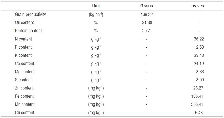 Table 3 shows the grain, oil, and protein yields, as well as the nutrient contents in Jatropha leaves. Grain yield was 138.22 kg ha-1, much lower than that estimated by Laviola and Dias (2008)}. The average oil content was 31.38%, very close to the 34% found by Laviola and Dias (2008). The protein content was 20.71%, relatively well below the range of 31 to 35% found by Machado and Silva (2019)}. It is believed that the reason for obtaining lower grain and protein yields is due to reduced micronutrient levels, since the aforementioned studies showed the highest leaf contents only for iron, manganese and copper.
