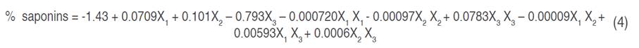 Quinoa husk was subjected to different extraction conditions by maceration method. The percentage of ethanol in the solvent (50 and 80%), temperature (50 and 60 °C), and extraction time (1 and 3 h) were the variables evaluated. The optimization study of the saponin extraction process was carried out by applying the response surface methodology (RSM), under a central composite design (CCD), for which two levels and three independent factors were defined, including ethanol concentration (X1), time (X2) and temperature (X3) in a factorial arrangement 23. The total number of experimental runs generated by the design was 20, with eight cube points, four central points in the cube, six axial points, and two central points in the axial (Table 1). For the axial points, an α=1.633 was used. The experiments were run randomly. The yield of extraction was calculated for the optimal conditions found by equation 1: