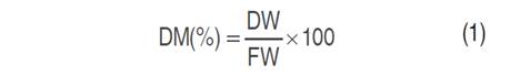 Where DM(%) represents the percentage of dry matter, DW constant dry weight, and FW is the fresh weight.