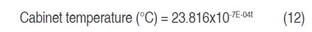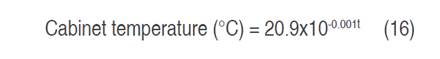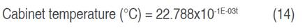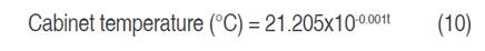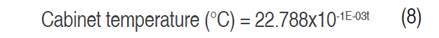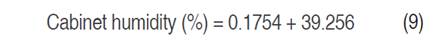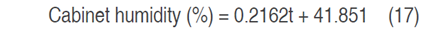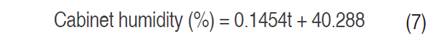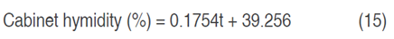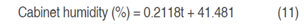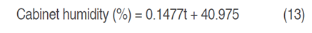 These relationships also indicate that it is possible to calculate the temperature and relative humidity (RH) inside the cabinet by knowing time (t) and the coefficient of correlation is very high and closer to 1 (R2=0.9).