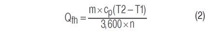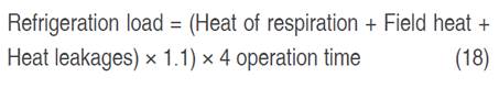 Where "Qfh" is the field heat (kW), "m" is the mass of tomatoes to be cooled (kg), "Cp" is the specific heat of tomatoes (kJ•(kg °C)-1), "T2" is the pre-cooling temperature (℃) of tomatoes and "T1" is the initial tomatoes in crates temperature (℃).