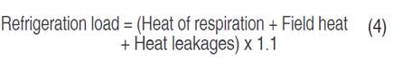 According to Sibanda (2019), field heat is the heat removed from freshly harvested tomatoes by introducing them into the cold store by reducing the field temperature of the tomatoes to the desired storage temperature. Field heat in the case of this study, therefore, is the amount of heat removed from the tomatoes as they cool from initial harvest temperature to pre-cooling temperature. The mass of the tomatoes is 50 kg, and the operating time is assumed at 4 h. The specific heat of tomatoes is 3.985 kJ•(kg °C)-1, according to Fellows (2000). The field heat calculated from the Equation (2):