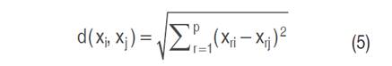 The K-NN (K-nearest neighbors) algorithm estimates the value of an unknown point based on similarity with neighboring points (Cover and Hart 1967). In this approach, the Euclidean distance between observations is calculated (Equation 5). According to Amat (2016), to ensure accurate estimates, it is necessary to normalize predictor values when their scales differ, as shown in Equation (6).