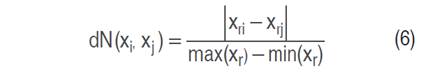 Where d is the Euclidean distance between the points xi and xj evaluated at the r-th input feature, max(xr) and min(xr) are the maximum and minimum values observed in the training set of xr.