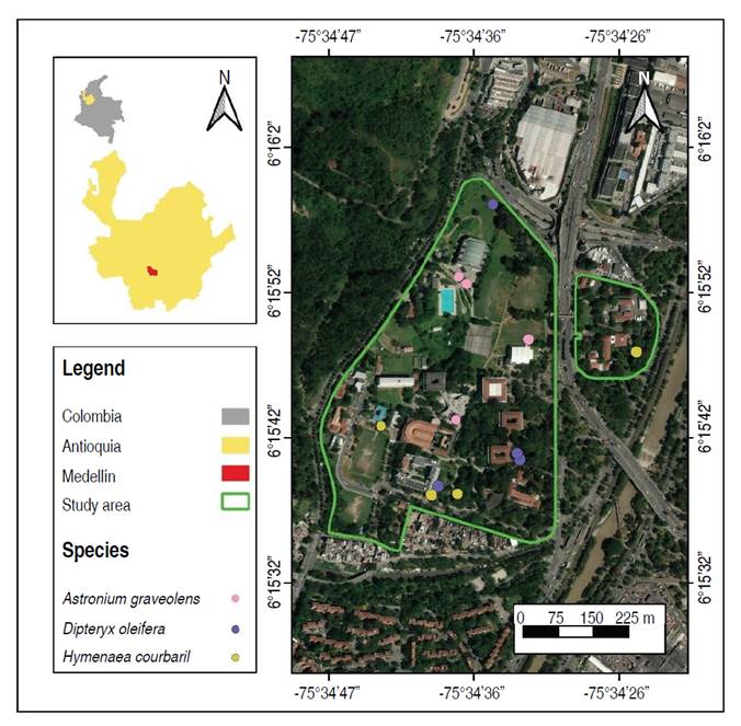 The research was conducted at the León Morales Soto Arboretum and Palmetum of the Universidad Nacional de Colombia, located in Medellín, Antioquia, Colombia (Figure 1). The study area climate is characterized by a mean annual air temperature of 19 °C and a mean annual precipitation of 1,752 mm (IDEAM 2010). These climatic conditions classify the area as belonging to the Premontane Rainforest (bh-PM) life zone, according to the Holdridge classification system.