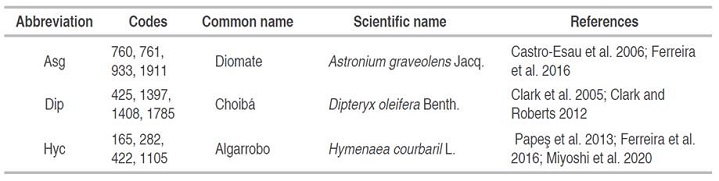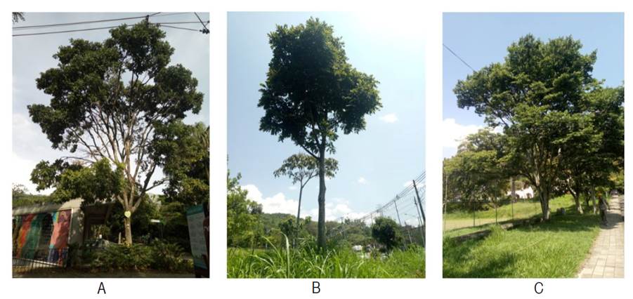 Choibá is classified as a Vulnerable Species (VU) in the Colombian Red Book of Plants (Cárdenas and Salinas 2007). On the other hand, Algarrobo (H. courbaril) is a forest species belonging to the Fabaceae family (Figure 2C). It exhibits compound, alternate, and paripinnate leaves, with a pair of elliptical leaflets 3-12 cm long and 1.5-7 cm wide (Gómez and Toro 2008). According to the IUCN Red List, Algarrobo is classified as Least Concern (LC) (Bachman 2023) and plays a crucial role in the restoration of the tropical dry forest in Colombia.