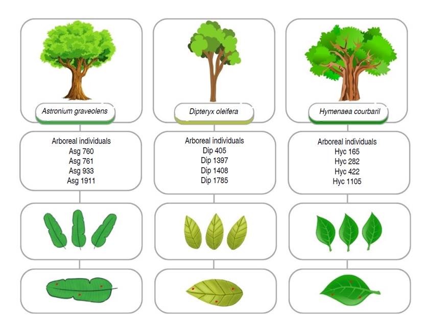 Diomate (A. graveolens) is a forest species belonging to the Anacardiaceae family (Figure 2A). It is characterized by compound, alternate, imparipinnate leaves that are arranged spirally. The leaves are composed of 11 to 15 lanceolate, acuminate, and serrate leaflets (Gómez and Toro 2008). According to the IUCN Red List, Diomate holds a classification of Least Concern (LC) (Machuca et al. 2022) and plays a vital role in the ecological restoration of the tropical dry forest in Colombia.