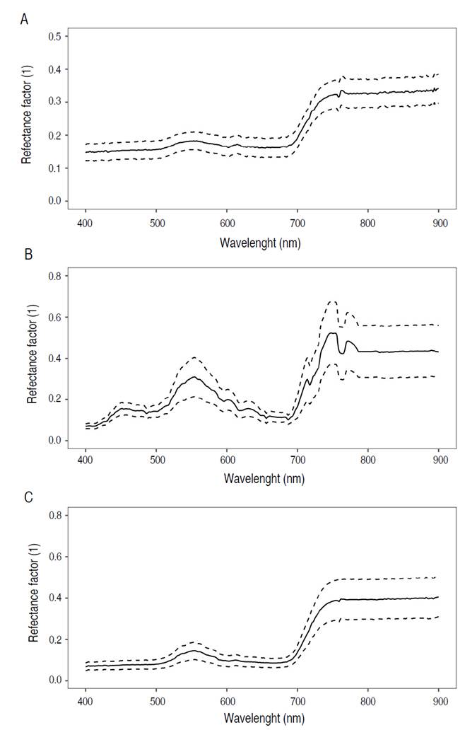 The spectral records (a total of 36 records per species) were processed using spectral interpretation software. This software allowed for the calculation of the mean and standard deviation of these records. Subsequently, spectral signatures were plotted using the ggplot2 package in RStudio 1.1.463, covering a wavelength range between 400 and 900 nm of the electromagnetic spectrum.