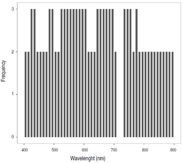 Considering previous research on the similarity in reflectance between contiguous bands and the advantages of using narrow bands, this study reduced the dataset by applying a simple averaging function every 10 nm. Originally, the data were distributed at 1 nm intervals between 400 and 900 nm. To obtain narrowbands every 10 nm, wavelengths were grouped into 10 nm ranges (for example, from 400 to 410 nm, from 410 to 420 nm, and so on). Within each of these ranges, the reflectance data were averaged to obtain the mean value of the corresponding narrowband, ranging from 405 to 895 nm. This process resulted in a reduced dataset where each narrowband represents an average reflectance within a specific wavelength interval.