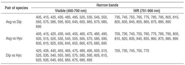 Figure 5 shows the number of species pairs that can be distinguished from each other (Asg vs Dip, Asg vs Hyc, and Dip vs Hyc). Significant differences were found in most spectral bands among all species pairs, except for the bands centered at 715 and 725 nm, corresponding to the red edge position (REP). The analysis revealed that 23 narrow bands effectively classified all species combinations, 25 narrow bands differentiated between two pairs of species, and only two narrow bands were able to distinguish one or fewer pairs of species.