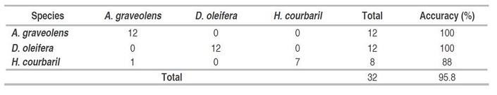 Furthermore, out of the eight data samples for H. courbaril, the classifier accurately classified seven instances, resulting in an 88% effectiveness. On average, the accuracy across the test dataset reached 95.8%. These results highlight the exceptional accuracy achieved in discriminating between different species using the significant narrow bands.