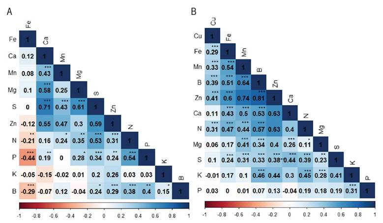 The correlation matrix shows that some elements are associated with others in avocado leaves and fruits (Figure 1). The conventional approach to interpreting a correlation coefficient correlation selected was a very strong correlation (greater than 0.900), strong correlation (between 0.700 and 0.899), moderate correlation (between 0.400 and 0.699), and weak correlation (between 0 and 0.399) (Schober et al. 2018). S is positive and strongly associated with Ca in leaves and moderately associated with Mg, Zn, and N. Mg is moderately associated with Ca. On the other hand, P and Fe show a negative moderate association. In addition, some elements, mainly Fe and K, show no or minimal correlation with others (Figure 1A). In fruit, Zn is positive and strongly associated with Mn and B and moderately associated with Fe, Ca, and N. B is moderately associated with N, Mn, and K. Conversely, no negative association was observed, and P shows no or minimal correlation with other (Figure 1B). Lazare et al. (2020) reported significant correlations in most nutrients with the others in cv. Hass leaves with the others. The strongest correlations (more than 0.7) were between Mg and Ca, P and Cu, Mg and Mn, N and P, and Mg and N.