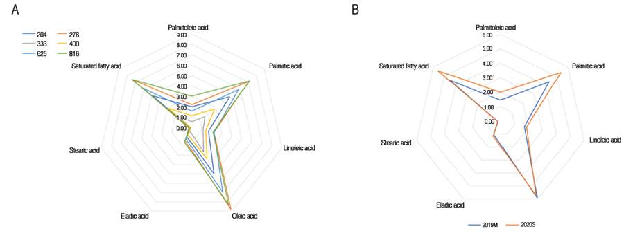 Figure 2 summarizes the contents of fatty acids present in the pulp of the fruits for the plant densities (Figure 2A) and harvest seasons (2019M and 2020S) (Figure 2B). The fruit harvested from trees in high densities presented the highest concentrations (g 100 g-1) of Palmitoleic acid (3.01), Palmitic acid (7.15), Elaidic acid (1.61), and saturated fatty acid (7.38). On the contrary, the plant density of 333 and 400 trees ha-1 had the lowest contents for this same group of acids (Palmitoleic acid - 0.55 g; Palmitic acid - 1.63 g; Linoleic acid - 1.11 g; Oleic acid - 2.63 g; Elaidic acid - 0.44 g; and saturated fatty acid - 1.73 g). Regarding the harvest season, in the 2020S, higher content of Palmitoleic acid (2 g), Palmitic acid (5.38 g), Linolenic acid (1.86 g), Elaidic acid (1.17 g), Stearic acid (0.19 g), and saturated fatty acid (5.57 g) were recorded. The 2019M harvest only presented higher values for Oleic acid (2.63 g).