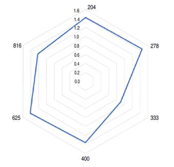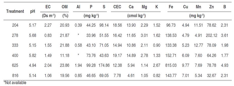 According to Salazar-García and Lazcano-Ferrat (2003), Maldonado-Torres et al. (2007) and Campos and Calderón (2015) the recommended reference levels of nutrients in leaves for Hass avocado vary for N (1.9 - 2.31%), P (0.11 - 0.18%), K (0.5 - 1.4%), Ca (1.0 - 3.0%), Mg (0.3 - 0.8%), Fe (85 - 114 mg kg-1), B (30 - 240 mg kg-1), Zn (20 - 150 mg kg-1) and Mn (30 - 500 mg kg-1). From these reference values and according to the mineral composition of the leaf, only values below the reference were observed for P (278 and 625 trees ha-1), which indicates that despite having observed significant differences in the concentration of nutrients in the leaf in response to the planting densities, in general the observed values were within the reference ranges for an optimal condition for the Hass cultivar water (Maldonado-Torres et al. 2007).
