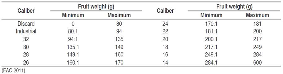 A random selection of 75 fruits per tree was each harvested. It was weighted and individually characterized by caliber according to established by the FAO in the CODEX STAN 197-1995 Revision (Table 2) for export sizes (FAO 2011).