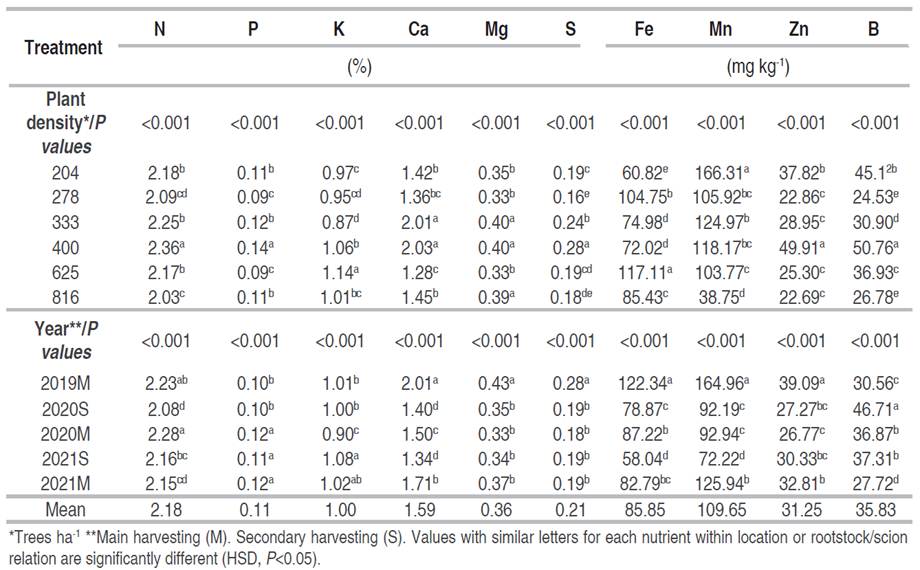 The statistical analysis was performed using the agricolae package in the R project statistical program (R Core Team 2021). A two-way ANOVA was carried out for the plant density factor (204, 278, 333, 400, 625, and 816 trees ha-1) and the harvest season factor (2019M, 2020S, 2020M, 2021S, and 2021M). Differences between means were evaluated through analysis of variance, followed by Tukey's HSD mean comparison test, with a probability greater than 95%. A Pearson correlation analysis was used to examine the relationship among the content of all nutrients in the fruit and leaves of avocado.