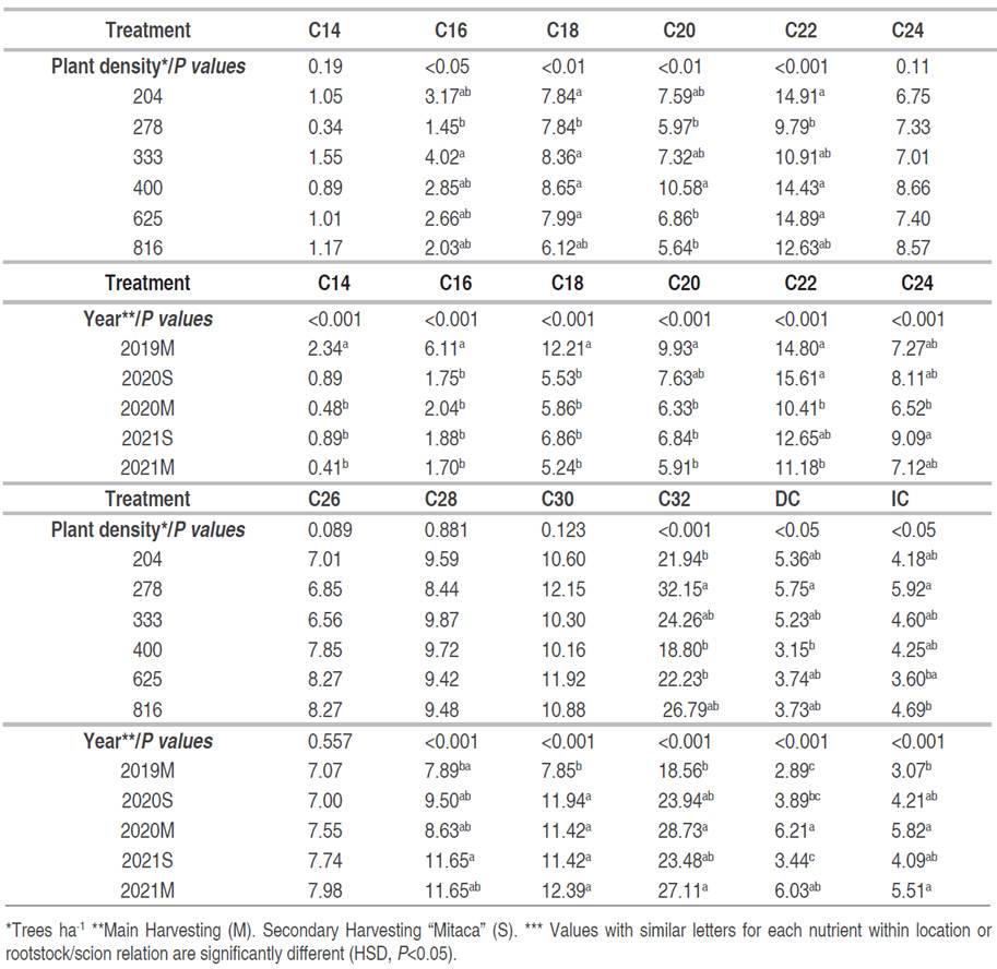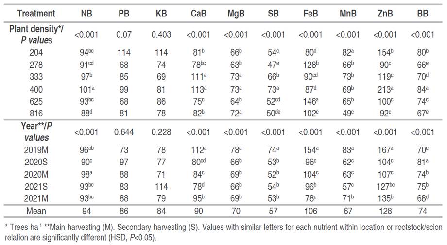 Table 3 shows the nutritional composition of avocado tree leaves, where there were significant differences due to plant density (P<0.001) and harvest time (P<0.001). The 333 and 400 trees ha-1 plant densities presented the highest leaf concentrations of N, P, Ca, Mg, S, Zn, and B. For K and Fe, higher concentrations were observed in the density of 625 trees ha-1, and Mn was present in higher concentrations in the density of 204 trees ha-1. On the contrary, the highest and lowest densities (204 and 816 trees ha-1) reached the lowest concentrations of the evaluated nutrients. The 2019M harvest presented the highest levels of nutrients for N, Ca, Mg, S, Fe, Mn, and Zn; the other nutrients do not show marked significant differences at a particular plant density (Table 3).
