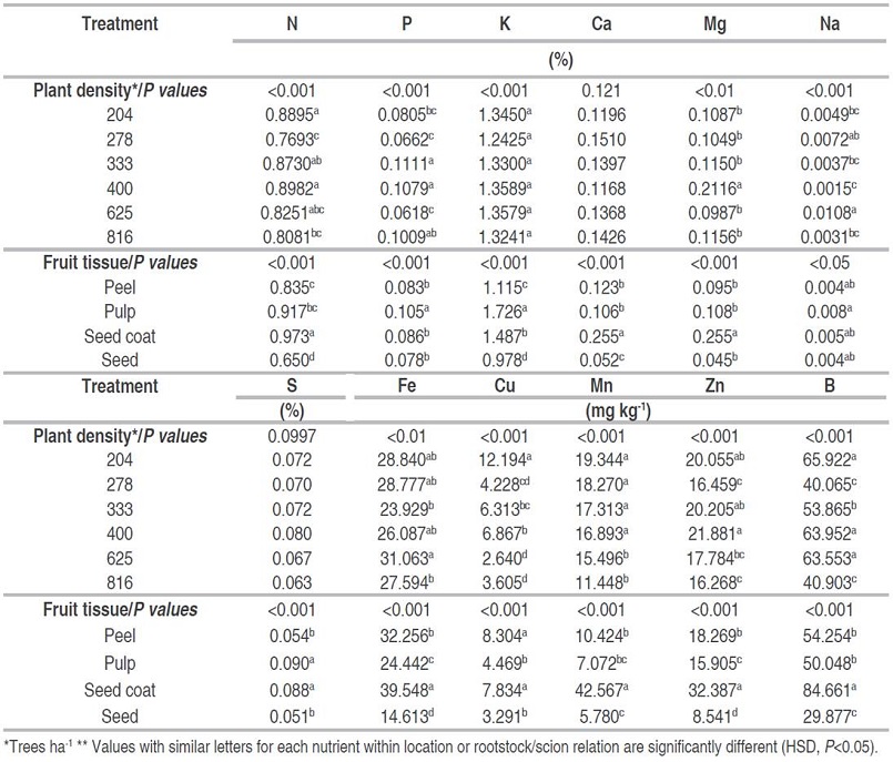 To evaluate the concentration of nutrients, 75 fruits were randomly taken per plant distance, and each harvest with approximately 24% of dry material. Subsequently, the fruit structures were individualized, removing the peel, pulp, seed coat, and seed. All the fruit components were dried until a constant weight was reached in forced air ovens at 60 °C. After drying, all fruit components were milled to determine N (EPA method 351.3) (USEPA 1993), P, K, Ca, Mg, Cl, S, Fe, Cu, Mn, Zn (inductively coupled plasma atomic emission spectrometer iCAP 7000 Plus (Thermo Scientific, Waltham, MA)), and B according to modified NTC 5404 (ICONTEC 2011), by treatment and harvest in each location.