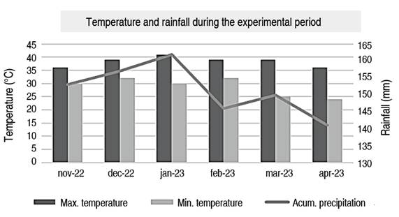 The research was conducted on the Facultad de Ciencias Agrarias campus of the Universidad Nacional de Concepción, located 2 km from the city of Concepción, Paraguay. The study was carried out from November 2022 to April 2023. The mean annual precipitation and temperatures can be appreciated in Figure 1.