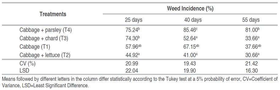 The results shown in Table 1 correspond to the determination of the percentage of weed incidence. It is observed that the lowest incidence rates are exhibited by treatments T1 (cabbage), T2 (cabbage + lettuce), and T3 (cabbage + chard).