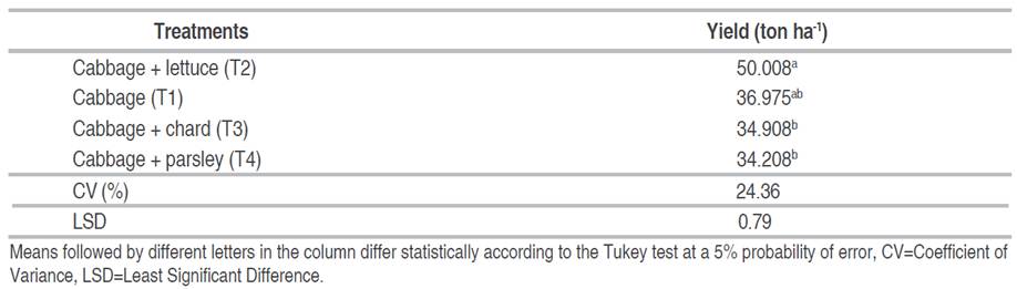 As indicated in Table 2, T2 exhibited superior outcomes in terms of weight, although its results are statistically equivalent to those observed in T1. A comparison of cabbage yield in monoculture and polyculture demonstrated that the crop in the monoculture system produced 36.975 (ton ha-1) and 50,008 (ton ha-1) in association with lettuce. However, statistically significant differences were observed when comparing the cabbage yield in association with lettuce and cabbage with chard and parsley.