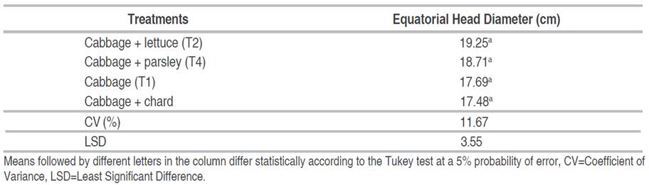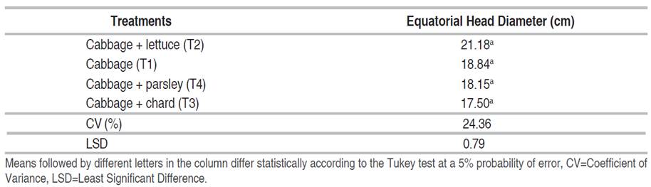 The analysis of variance (ANOVA), as presented in Table 3, revealed no statistically significant differences between the treatments in the determination of the equatorial diameter of the head of cabbage using two production systems (monoculture and association). The resulting data yielded the following measurements: 18.84 cm (T1), 21.18 cm (T2), 18.15 cm (T3), and 17.50 cm (T4).