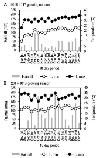 Experiments were conducted in soybean fields at Palotina, Paraná, Brazil, during the 2016-2017 and 2017-2018 growing seasons using two soybean cultivars per season. The soils were very clayey (14% sand, 22% silt, and 64% clay), originated from basalt, and had a pH=5.9 and organic matter of 2.7%. The fields were managed under no-tillage, with a soybean-maize rotation system. The climate of the region is classified as Cfa according to the Köppen, with the weather conditions for the experimental period illustrated in Figure 1.
