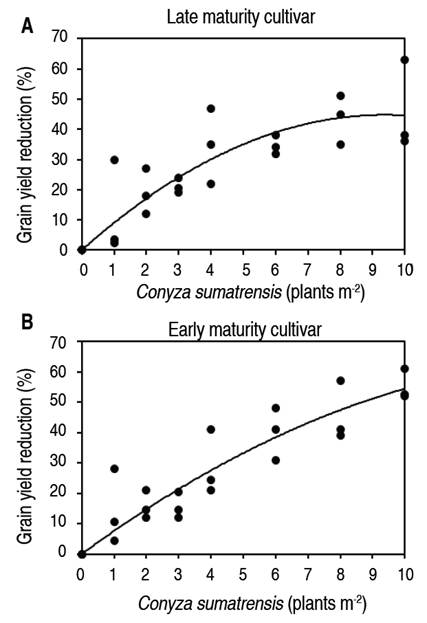 The grain yield reduction observed for the late-maturity cultivar was 12.54 and 13.72% per plant of C. sumatrensis, in the 2016-2017 and 2017-2018 growing seasons, respectively. The early maturity cultivar showed a reduction of 9.35 and 10.77% per plant of C. sumatrensis, in the 2016-2017 and 2017-2018 growing seasons, respectively.Conyza sumatrensis cannot be tolerated in soybean crops, because a single plant per m2 has great potential for reducing grain yield.