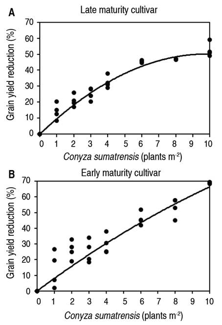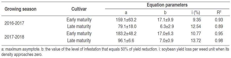 Conyza sumatrensis substantially reduced soybean yield even under low densities in both cultivars and seasons. For the early maturity soybean cultivar, infestation levels of 17.1 and 17 (parameter b) of C. sumatrensis m-2 in the 2016-2017 and 2017-2018 growing seasons, respectively, were required to cause a 50% yield loss of soybean crop. For the late-maturity cultivar, the values were 6.3 and 7.0 in the 2016-2017 and 2017-2018 growing seasons, respectively. In the 2016-2017 growing season, the parameter "i" (proportional yield loss when the weed density approaches zero) was 12.5% for the late-maturing cultivar and 9.35% for the early-maturity cultivar. In the 2017-2018 growing season, the parameter "i" was 13.7% for the late-maturity cultivar, whereas it was 10.77% for the early-maturity cultivar, which was 22% lower compared to the late-maturity cultivar. That is, a single plant of C. sumatrensis m-2 can reduce soybean yield by up to 13.7% (Table 1).