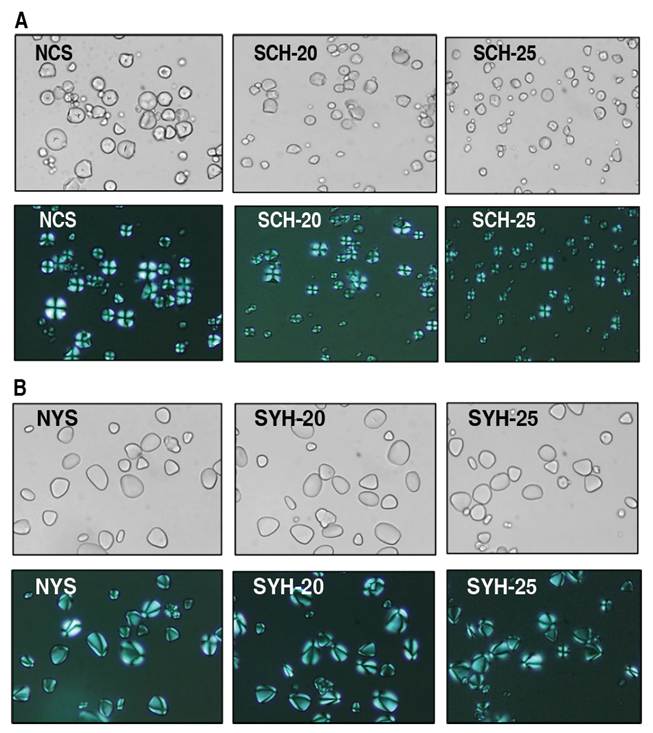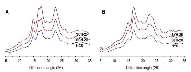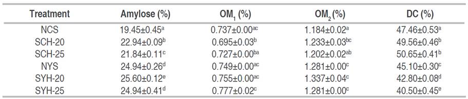The effect of HMT on DC is presented in Table 2. NCS showed a DC of 47.46%, consistent with findings reported by Figueroa-Flórez et al. (2019). After HMT, a significant increase (P<0.05) was observed in SCH-20 and SCH-25. Similar results were reported in cassava starch treated with HMT by Moraes et al. (2014), who argued that HMT leads to a reorganization of starch molecules, enhancing molecular interactions and thereby increasing crystallinity (Van et al. 2017). Meanwhile, NYS presented DC similar to that reported for yam starch (Arroyo-Dagobeth et al. 2023). After HMT, a decrease in DC was observed, proportional to the increase in moisture content in the SYH-20 and SYH-25 treatments. This decrease in DC is more evident at higher moisture levels, as water may contribute to the disruption of intra- and intermolecular hydrogen bonds within the starch granule (Liu et al. 2016).