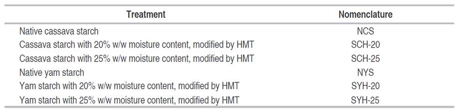 Cassava and yam starches were hydrothermally modified following the method proposed by Klein et al. (2013), with slight modifications. Initially, 30 g samples (d.b.) were hydrated to a moisture content of 20 and 25% (w/w), and then stored at room temperature for 24 h to ensure homogenization. Subsequently, the hydrated samples were subjected to 90 °C for 4 h in a forced convection oven (FD115, BINDER, Germany).