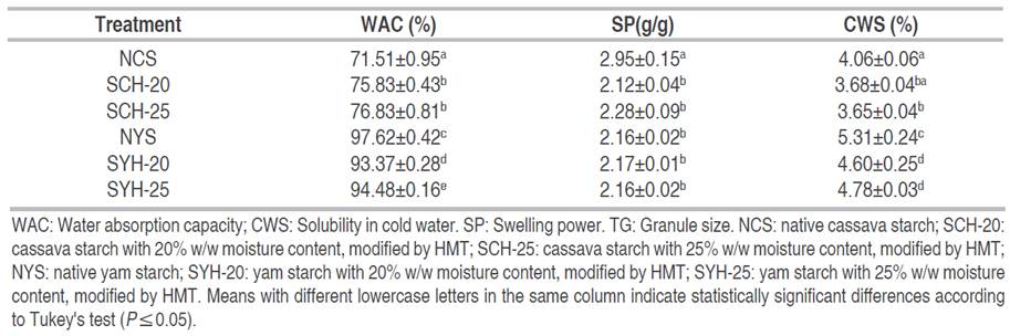 (CWS), and swelling power (SP) of cassava and yam starches are shown in Table 3. NCS exhibited a WAC in the range of 70-75%, similar to results reported for cassava starch by Salcedo-Mendoza et al. (2017). After HMT treatment, cassava starches showed higher WAC (P<0.05), consistent with results reported by Liu et al. (2016) for HMT-treated starch. These authors suggest that such changes in WAC are likely associated with stronger interactions between hydroxyl and water molecules in HMT-treated samples compared to their native counterparts. NYS exhibited WAC in the range of 95-98%, consistent with values reported by Otegbayo et al. (2011) for yam starch. After HMT, yam starches showed a significant decrease (P<0.05) in WAC (Table 3).