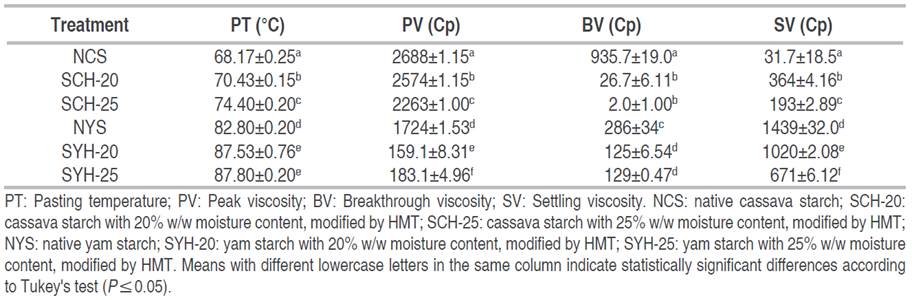 The viscosity behaviors of native and modified starches are presented in Table 4. The NYS treatment showed a significantly higher (P<0.05) pasting temperature (TP) compared to NCS. A higher TP suggests greater internal stability of the starch granule, an increased presence of semicrystalline regions, and is generally associated with a higher amylose content (Salgado et al. 2019). Regarding viscosities, NCS exhibited a higher peak viscosity (PV) than NYS. Additionally, the BV values indicated greater stability for the NYS treatment, while the SV was higher in NYS compared to the NCS treatment. Similar findings on cassava and yam starches were reported by Arroyo-Dagobeth et al. (2023), who concluded that differences in these starchy materials are influenced by crystalline pattern type, as starches with a B-type diffraction pattern exhibit greater retrogradation compared to those with an A-type pattern (Klein et al. 2013).