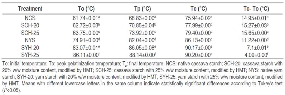 In contrast, native yam starch showed SP values ranging from 2.1 to 2.3%, consistent with those reported for Dioscorea bulbifera L. starch by Meaño et al. (2018). The HMT-modified yam starch did not show significant differences (P<0.05) compared to the native starch. This suggests that hydrothermal treatment did not affect the granular morphology of yam starch, resulting in limited granule swelling. This finding is supported by the micrographs (Figure 2B) in this study, which indicate that the structure and size of the granules remained similar to those of the native starch.