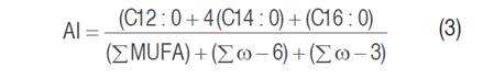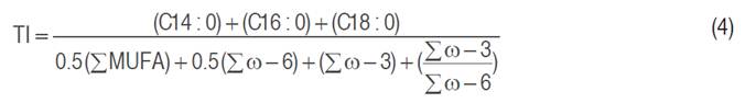 The functional quality of the oil was determined with the data of the fatty acid profile, which were the atherogenicity index (AI) according to Equation 3 (Ratusz et al. 2018), the thrombogenicity index (TI) according to Equation 4 (Ratusz et al. 2018) and the hypocholesterolemic/hypercholesterolemic ratio (H/h) according to Equation 5 (Santos-Silva et al. 2002).