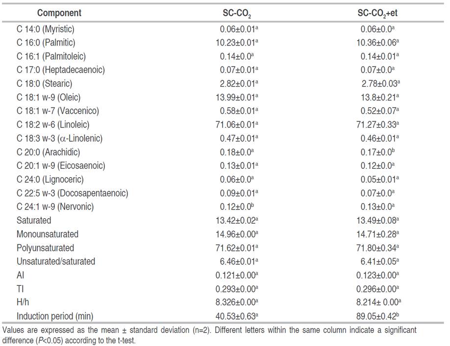 The induction time of the oils was measured to evaluate their oxidative stability and compare the stability of both oil samples. Despite having a similar fatty acid profile, the oil extracted with SC-CO2+et presented a higher induction time value (Table 1). The shorter induction time of SC-CO2 oil (40.53 min) suggests it may be more susceptible to oxidation compared to the SC-CO2+ethanol oil (89.05 min). Consequently, the oil extracted with SC-CO2+ethanol can be considered more stable, likely due to the presence of polar compounds such as phenols, which contribute antioxidant properties and help extend the oil's shelf life.
