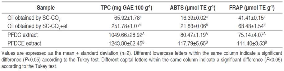 The antioxidant capacity of the oils obtained by SC-CO2 and SC-CO2+et, and the ethanolic extracts PFDC and PFDCE were determined in duplicate and by two methods: