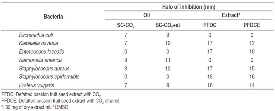 The antimicrobial activity of the passion fruit seed oil and defatted passion fruit seed dry extract samples against gram (+) and gram (-) bacterial strains is shown in Table 3. The results show that the passion fruit seed oil extracted with SC-CO2 and SC-CO2+et presented antimicrobial activity against the bacteria Escherichia coli, Klebsiella oxytoca, Salmonella enterica, Staphylococcus aureus and Proteus vulgaris with larger halo sizes for the oil obtained with SC-CO2+et, this positive effect would be due to the composition of fatty acids, antioxidants and flavonoids of passion fruit oils (Purohit et al. 2021).