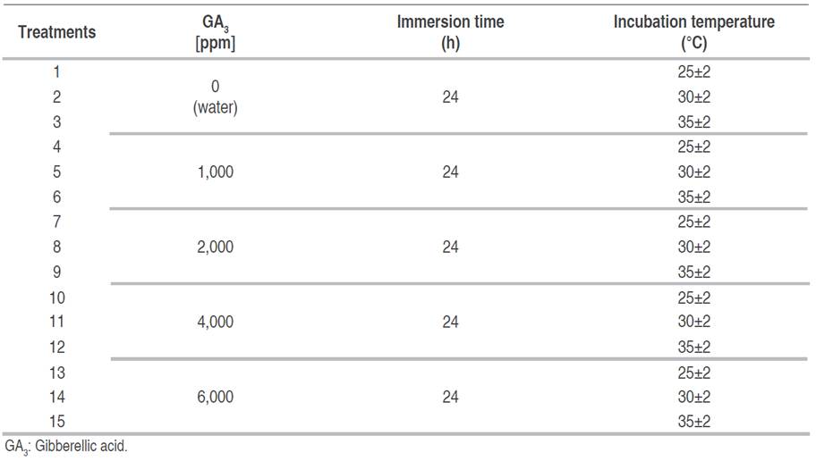 The experiment was conducted using a completely randomized design with a factorial arrangement (5x3), where the effects of five levels of gibberellic acid concentration, combined with three incubation temperatures were evaluated. Prior to treatment application, all seeds were stratified at 4 °C for 31 days, followed by a 24-hour immersion in their respective GA3 solutions and water. The methods and factors evaluated in the germination process are detailed in Table 1.