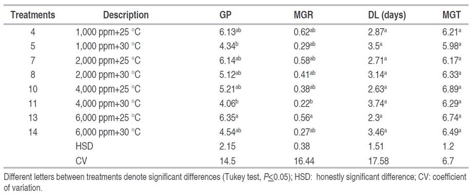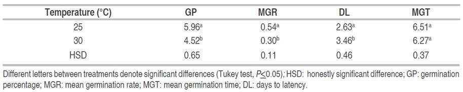 According to the results obtained from the mean comparisons, significant differences (P<0.05) were found in all evaluated variables, except for the mean germination time (MGT). This suggests that Actinidia chinensis var. chinensis seeds responded differently to the various constant temperature levels used during the incubation process (25, 30 and 35 °C).