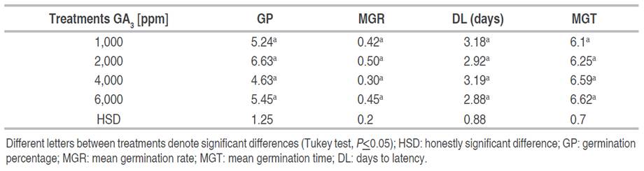 After completing the germination evaluations, the following response variables were calculated: germination percentage (GP), mean germination rate (MGR), mean germination time (MGT), and days to latency (DL). Since these variables did not follow a normal distribution according to the Shapiro-Wilk test (P<0.05), a square root transformation was applied to normalize the data and meet the assumptions required for the analysis of variance (ANOVA).