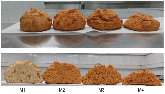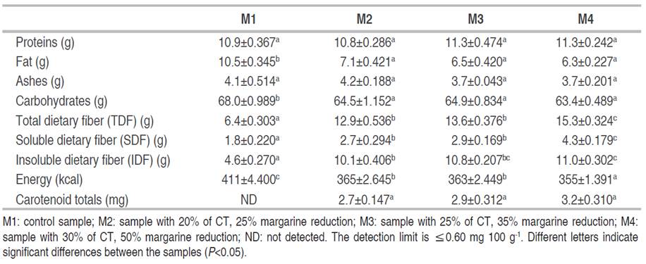 As shown in Table 2, the protein and ash content do not exhibit statistically significant differences between the analyzed samples. In contrast, the fat content was significantly higher (P<0.05) in the control sample and demonstrated a reduction with increasing CT incorporation. The carbohydrate content was significantly higher (P<0.05) in sample M1. Statistically significant differences (P<0.05) were observed in the total dietary fiber (TDF) content, with M1 displaying the lowest value and M4 the highest. A similar trend was observed for soluble dietary fiber (SDF) and insoluble dietary fiber (IDF). The caloric intake is significantly higher in M1 and significantly lower in M4 (P<0.05).