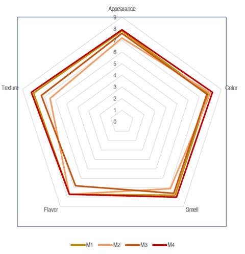 Overall, the samples demonstrated high sensory acceptability, as illustrated in Figure 2. Appearance was rated significantly higher (P<0.05) in M1 and M4. No significant differences were found in the color of the samples. Regarding aroma, significant differences (P<0.05) were observed, with M4 receiving the highest acceptability score and M2 the lowest. Flavor acceptability was significantly higher (P<0.05) in M1, M2, and M4. Texture was also rated significantly higher (P<0.05) in M1 and M4.