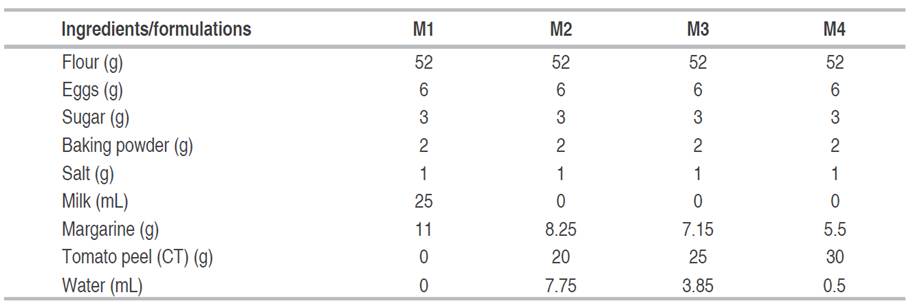 Scones were made for a traditional recipe based on flour, eggs, margarine, milk, sugar, baking powder, and salt. Three formulations were developed in which milk was eliminated; the margarine concentration was reduced by 25, 35, and 50%; and CT was added at 20, 25, and 30% of the total mass. A control sample, without tomato peel, was also prepared. The dough was divided into units of 50 g and baked in an oven at 175 °C for 20 minutes. The formulations are presented in Table 1.