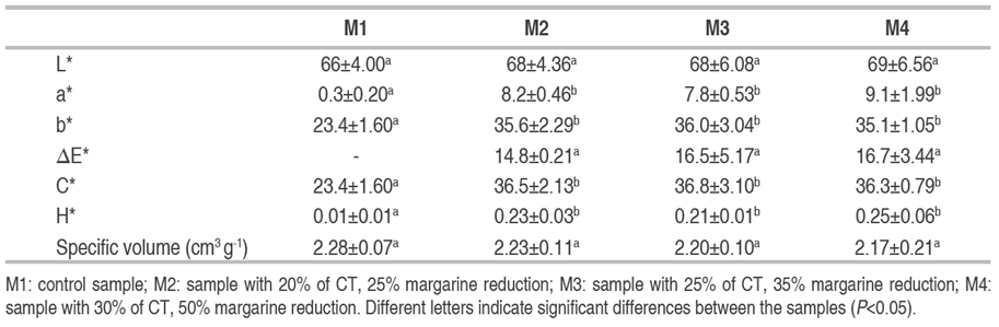 Instrumental color was evaluated for CIELab values with a Hunter colorimeter and specific volume according to the seed displacement method (AACC 2010).