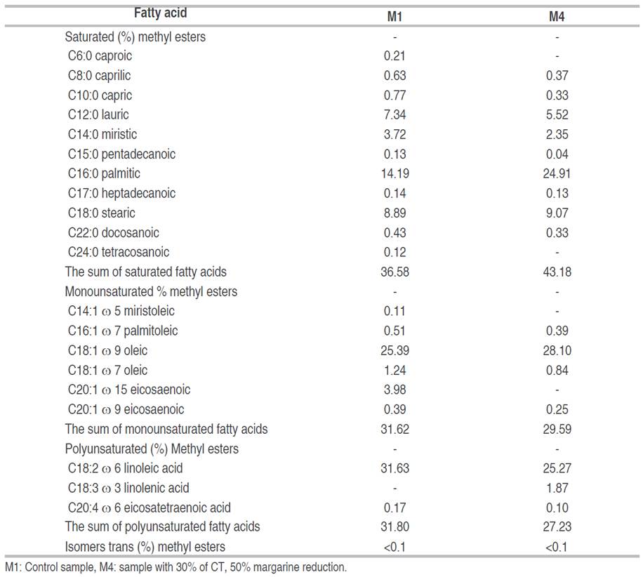 Based on the results presented in Table 4, sample M4 exhibits a higher proportion of saturated fatty acids compared to M1. The amount of monounsaturated fatty acids is similar between the samples, while polyunsaturated fatty acids are present at a slightly higher concentration in M1. Notably, sample M4 contains linolenic acid, whereas trans fatty acid content is below 0.1% in both samples.