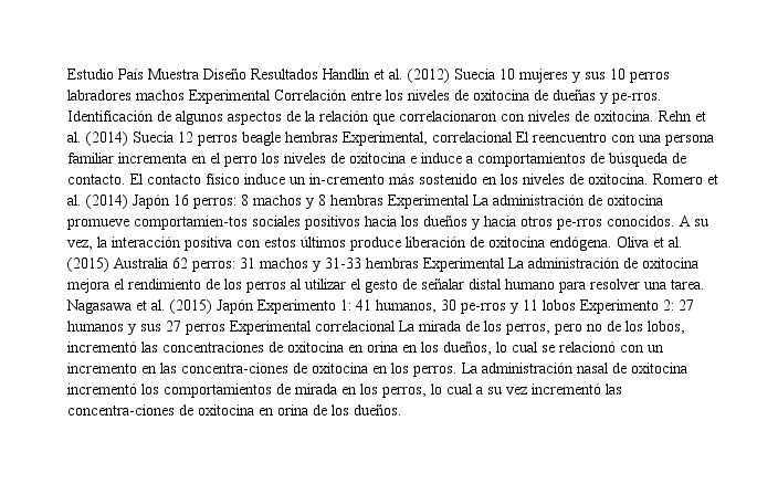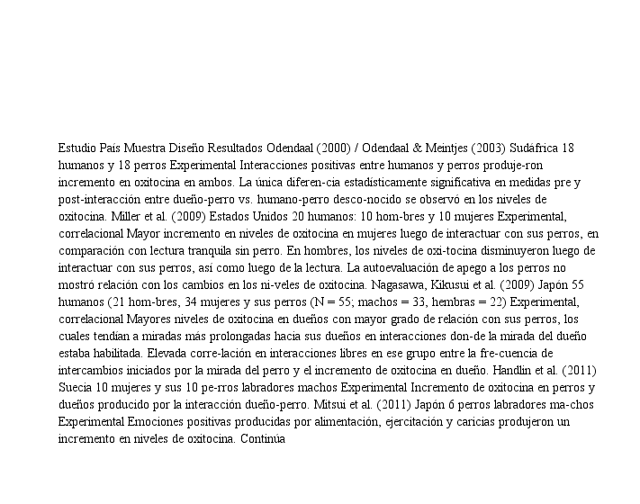 El objetivo del estudio que se informa fue realizar una revisión sistemática de publicaciones científicas ligadas a la interacción humano-animal y de trabajos empíricos que evalúen los niveles de oxitocina en humanos y / o perros, o bien se administre oxitocina, sobre los cuales elaborar conclusiones acerca del rol desempeñado por esta neurohormona en la relación humano-perro de compañía.