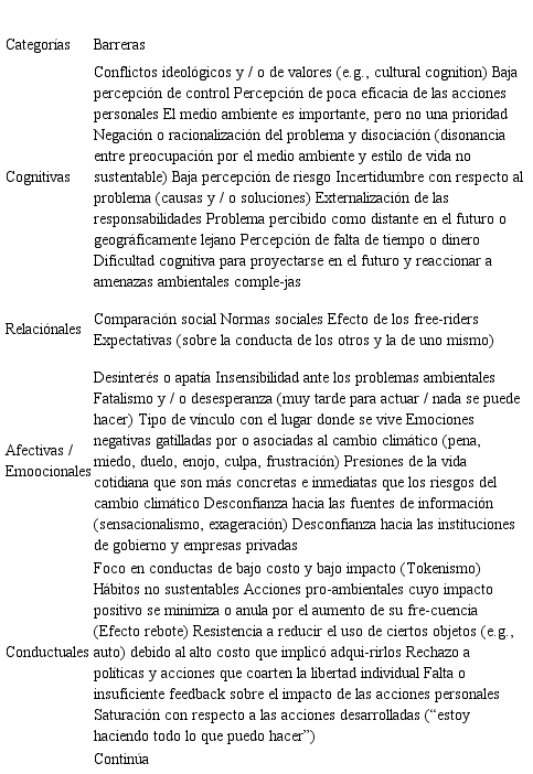 Lorenzoni, Nicholson-Coleb y Whitmarsh (2007) identificaron barreras individuales y sociales, las cuales pueden ser también conscientes o inconscientes. Entre otras, estas incluyen las resistencias para cambiar estilos de vida, la prevalencia de lo económico, la poca valoración de los sacrificios o cambios personales comparados con la responsabilidad de gobiernos e industrias, etc. (ver Cuadro 1).