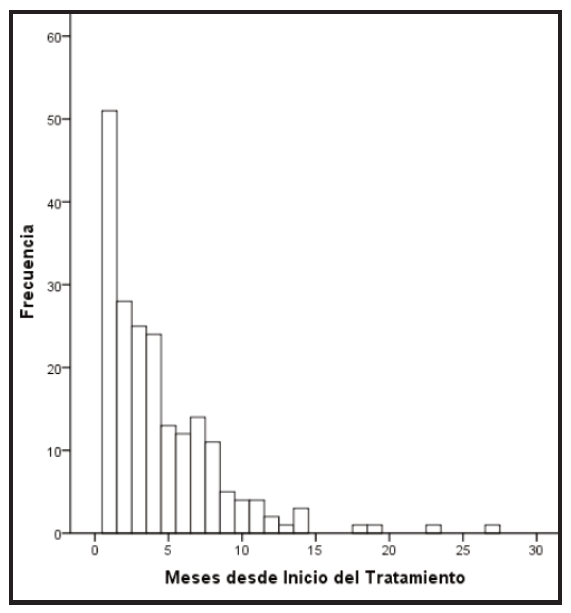 En el Gráfico 1 se presenta la distribución de los participantes según la cantidad de meses desde el inicio del tratamiento. La distribución asimétrica positiva del tiempo en tratamiento se puede explicar por las altas tasas de abandono observadas en este tipo de tratamientos, que según datos de un estudio realizado previamente en el AMBA es del 66.7%, teniendo los pacientes de estos abordajes una media de permanencia en los tratamientos de 121 días (OAD, 2009).