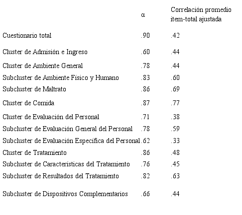 Sin embargo, para tener una aproximación de la confiabilidad de la escala se presentan a continuación los coeficientes Alpha de Cronbach (como evidencia de consistencia interna) y el promedio de las correlaciones ítem-escala ajustadas (como evidencia de la homogenedidad de los ítems), del cuestionario total, los clusters y los subclusters (ver Tabla 1).